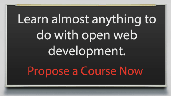 Based on these guidelines we’ve already had proposals for some amazing courses including PHP Web Application Security, jQuery~For the Love of Dollar, PHP, Databases and the OpenWeb, Alt Text & Universal Design and From GIMP to xHTML and CSS.